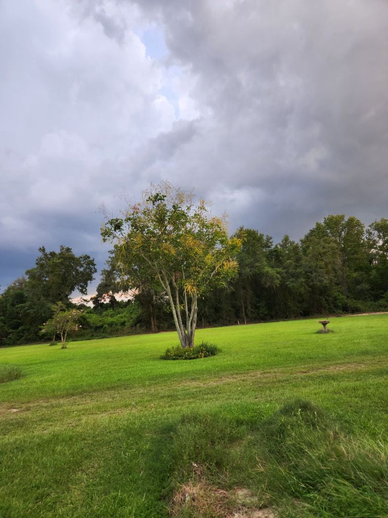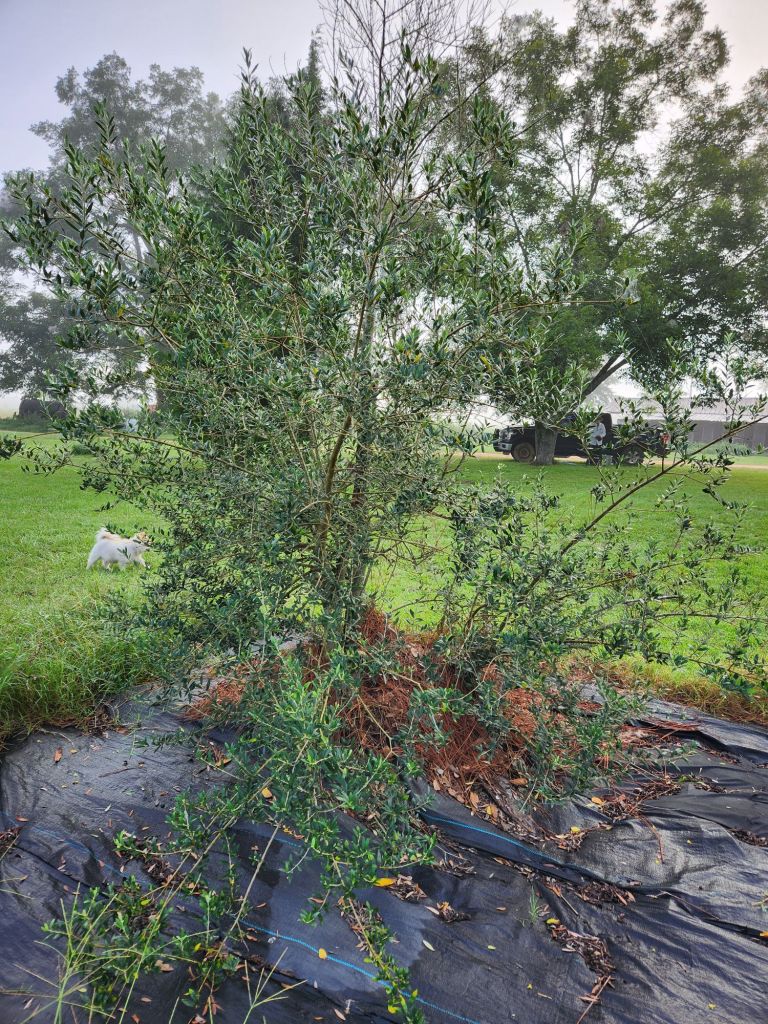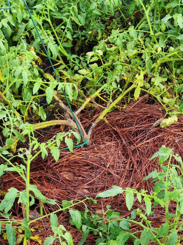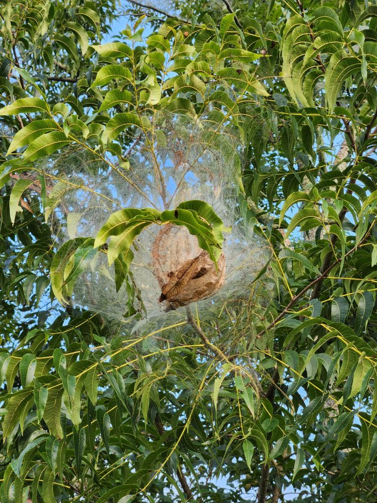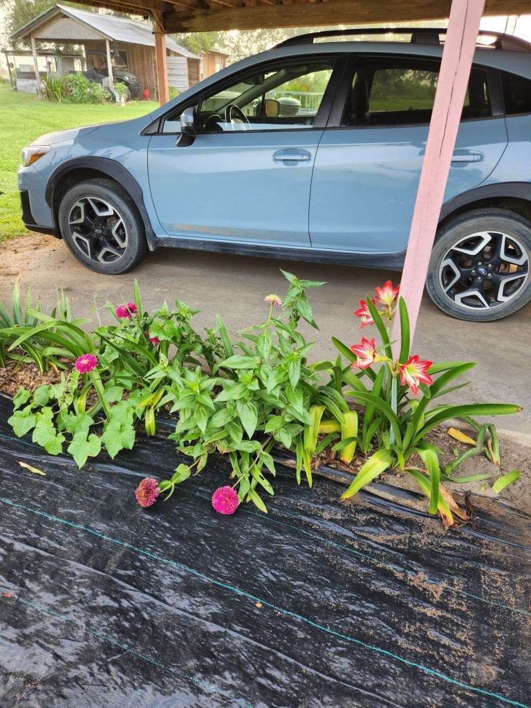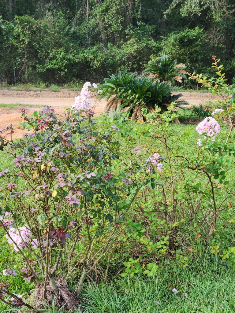 Mites on Camilla Tree. Diatomaceous earth helps.Tiny worms build these nests in Pecan Trees. Time to spray.Time for a trim.Miniature Gardenia needs weeding.High enough for no interference.Low enough to show how some can be though.Pinestraw and corn stalks.Vines in Bridal Wreaths.Wood ash on purple rose, watered and sealed in. Olive tree is coming back clean. Concord Grape is looking good.Pinestraw on tomato vines.Amaryllis, Zena, and Lamb’s Bed. Plus car, 2019 Crosstrek.