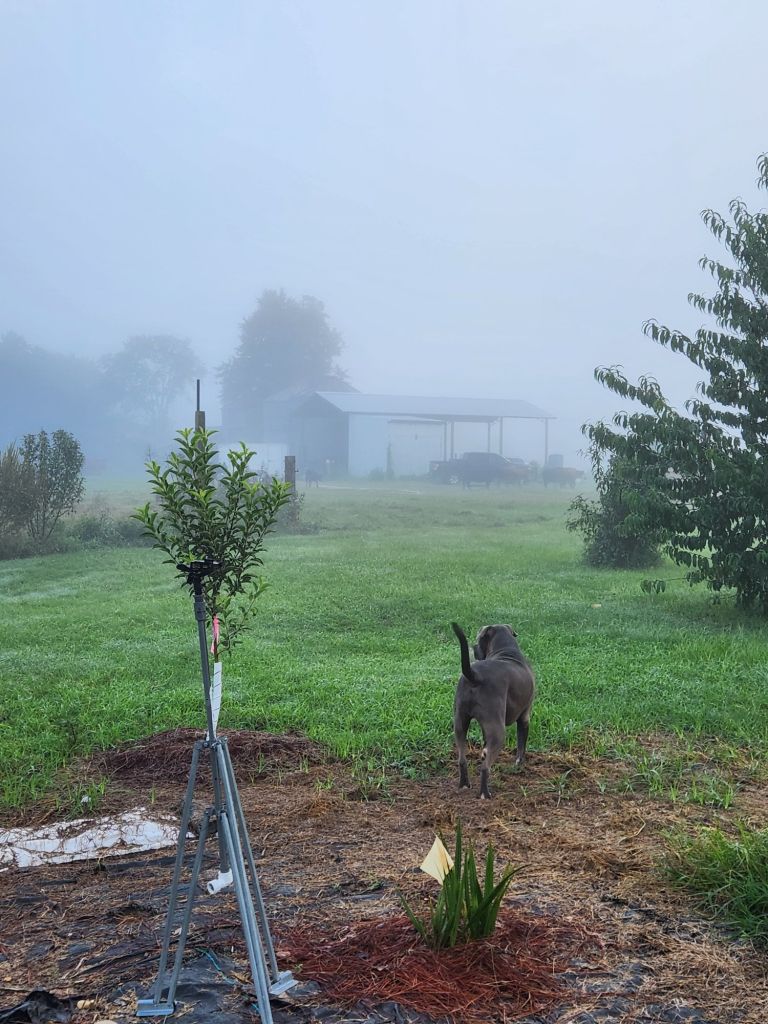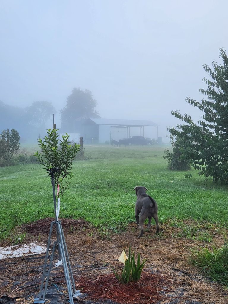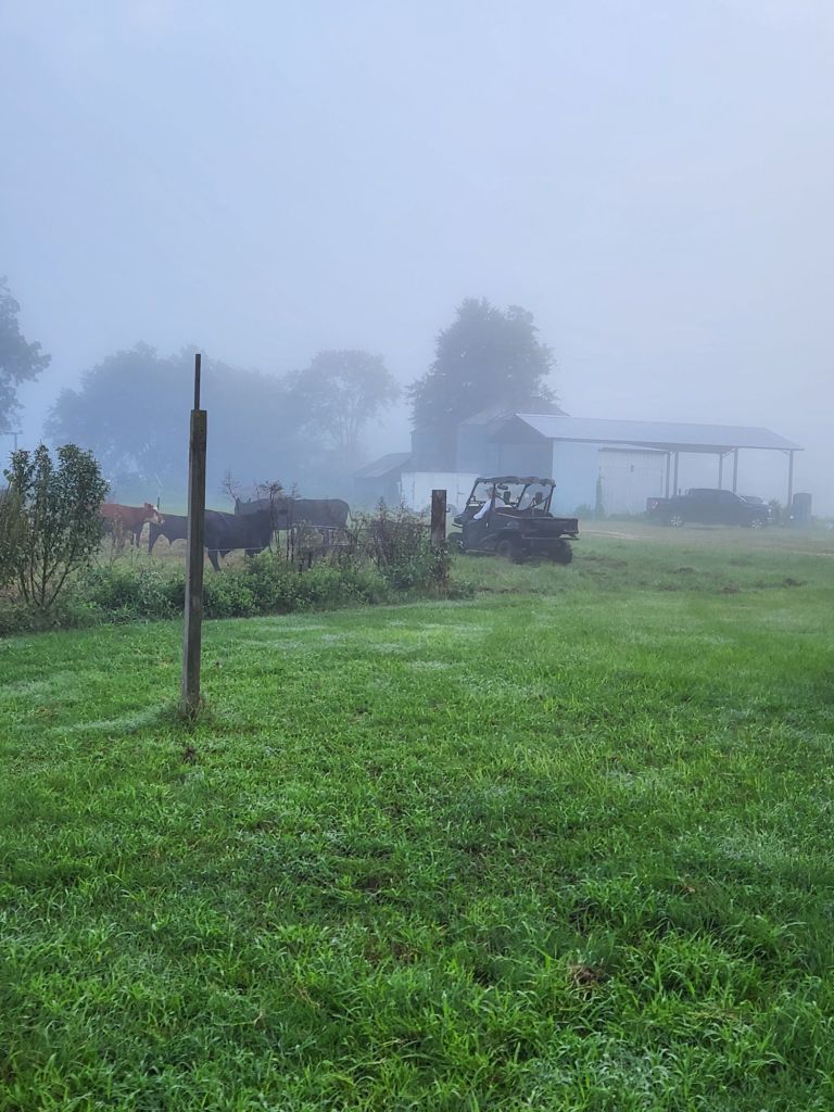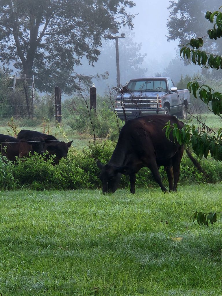 Good Morning.She wants her baby.The grass always looks greener on the other side.Getting her belly full.7 am on Sabbath morning,What would Jesus do?Ready for Fall?The black birds are going South, shortly.The Holy Spirit heals Turkey figs.Peach Tree needing a trim.Good pole for grape vine.Looks almost like Hitchcock’s “Birds”.Getting cows in.Zenas helps this Bartlett Pear Tree grow. Max don’t bother cows.He said, No.Getting cows up.Cows know buggy sounds.Max is not going.