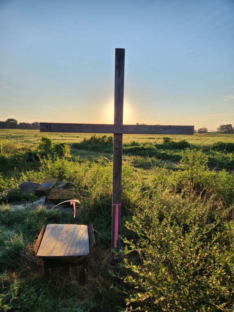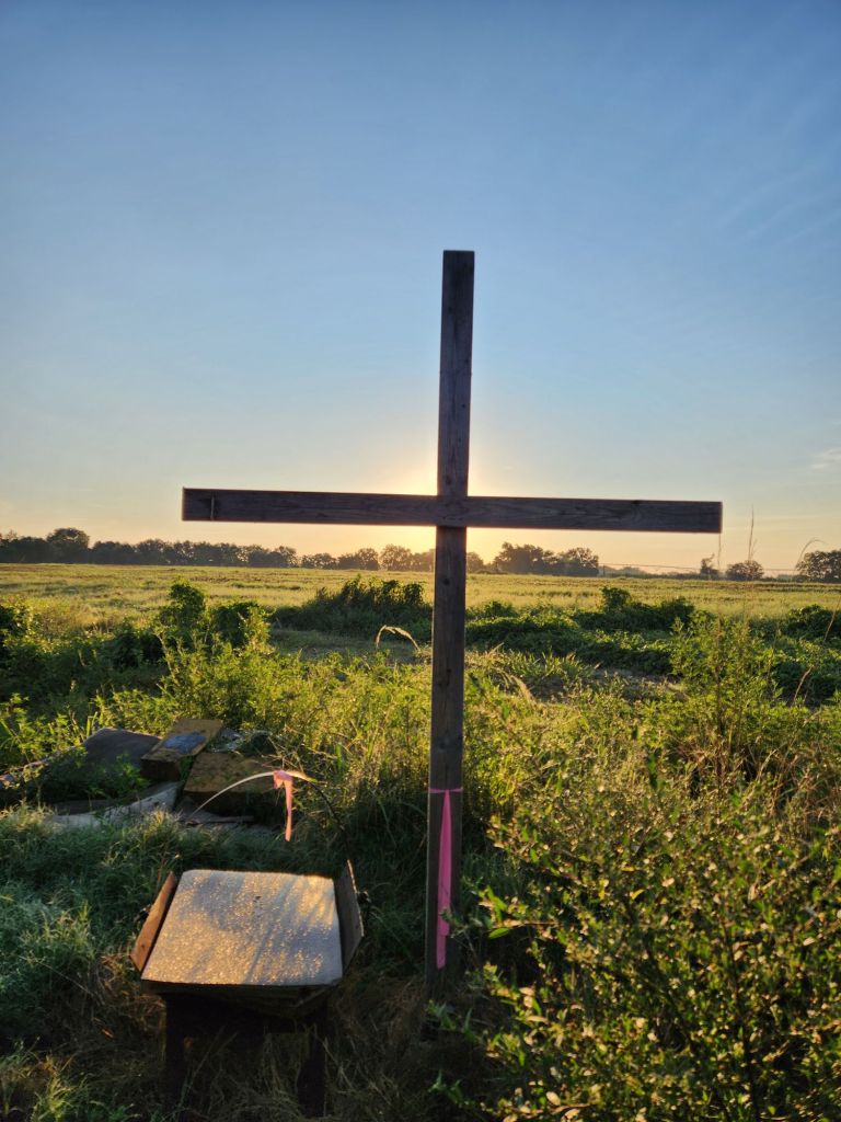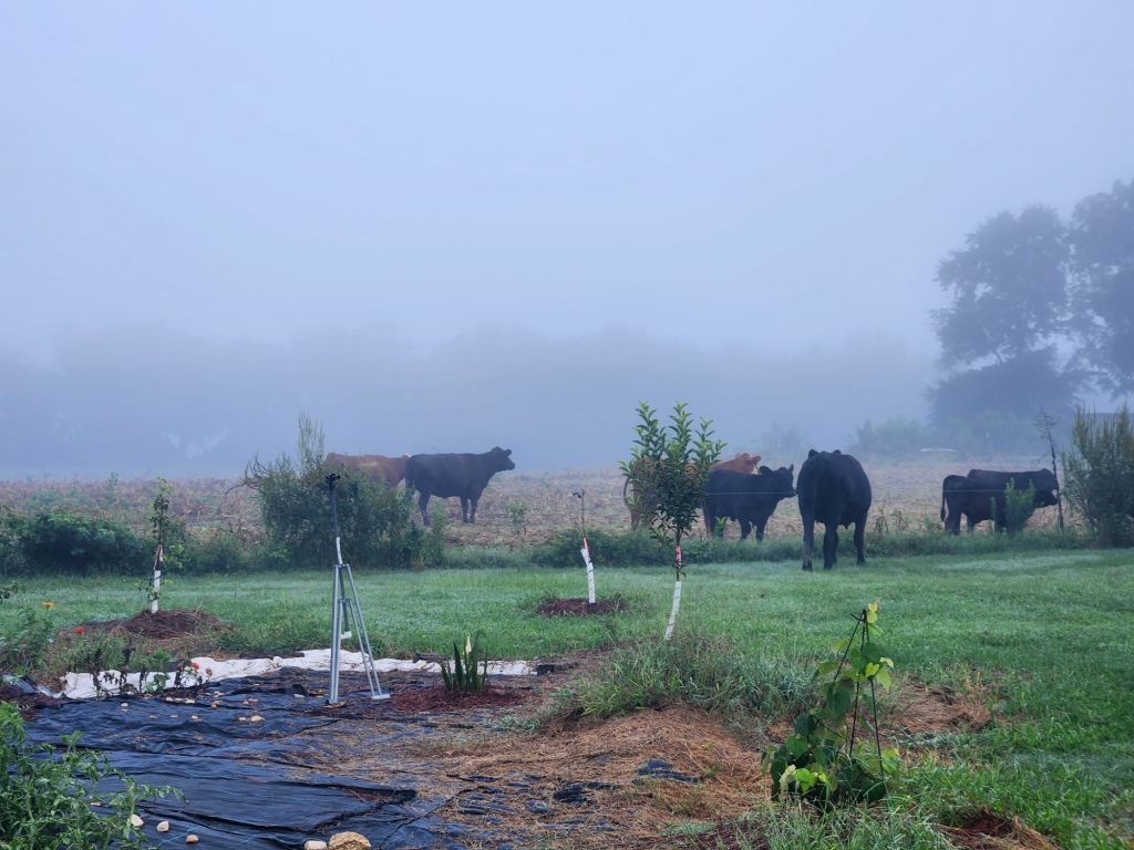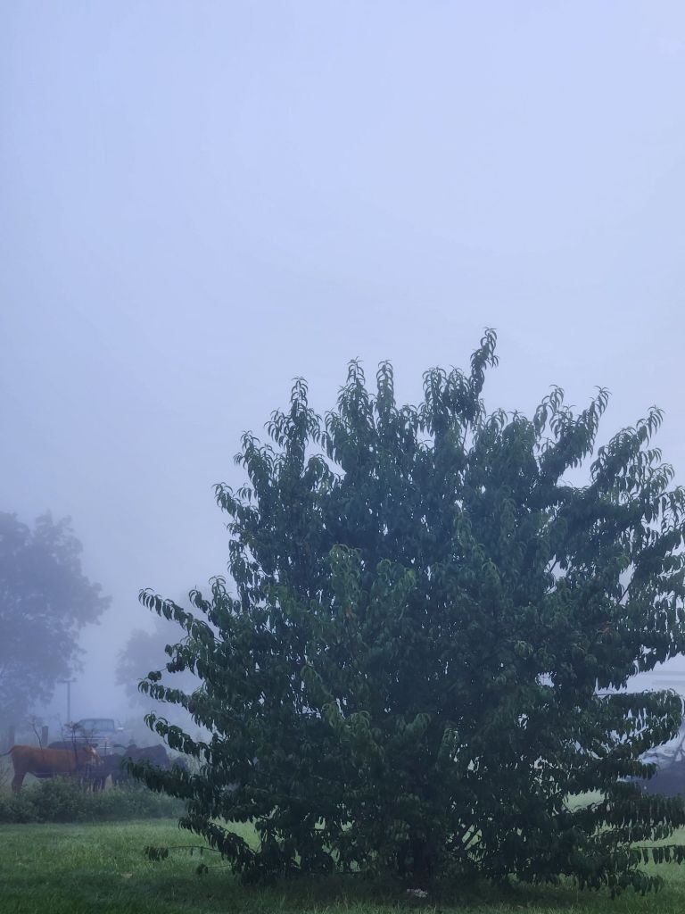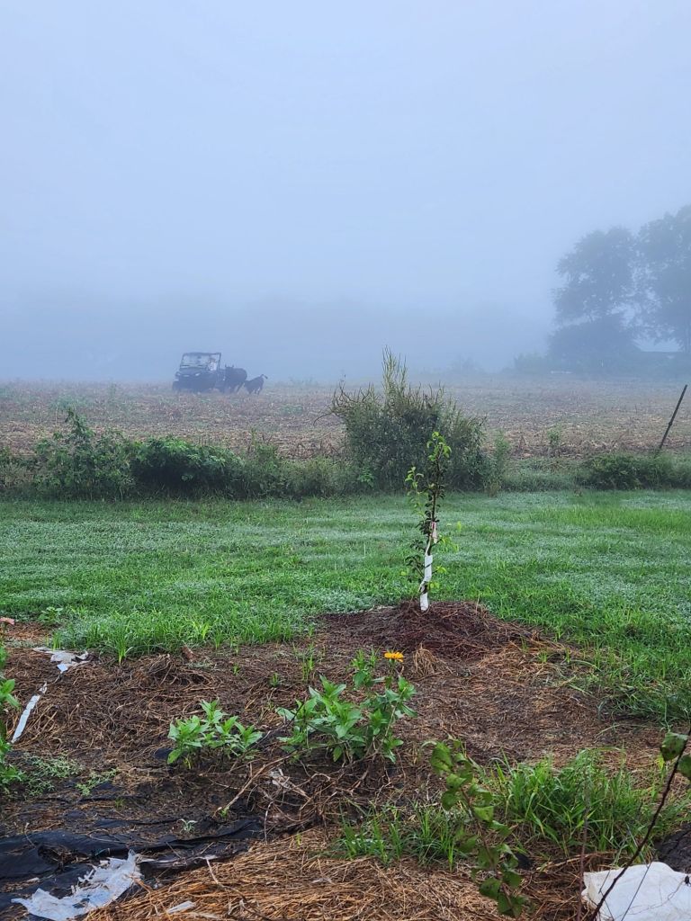 Good Morning.She wants her baby.The grass always looks greener on the other side.Getting her belly full.7 am on Sabbath morning,What would Jesus do?Ready for Fall?The black birds are going South, shortly.The Holy Spirit heals Turkey figs.Peach Tree needing a trim.Good pole for grape vine.Looks almost like Hitchcock’s “Birds”.Getting cows in.Zenas helps this Bartlett Pear Tree grow. Max don’t bother cows.He said, No.Getting cows up.Cows know buggy sounds.Max is not going.